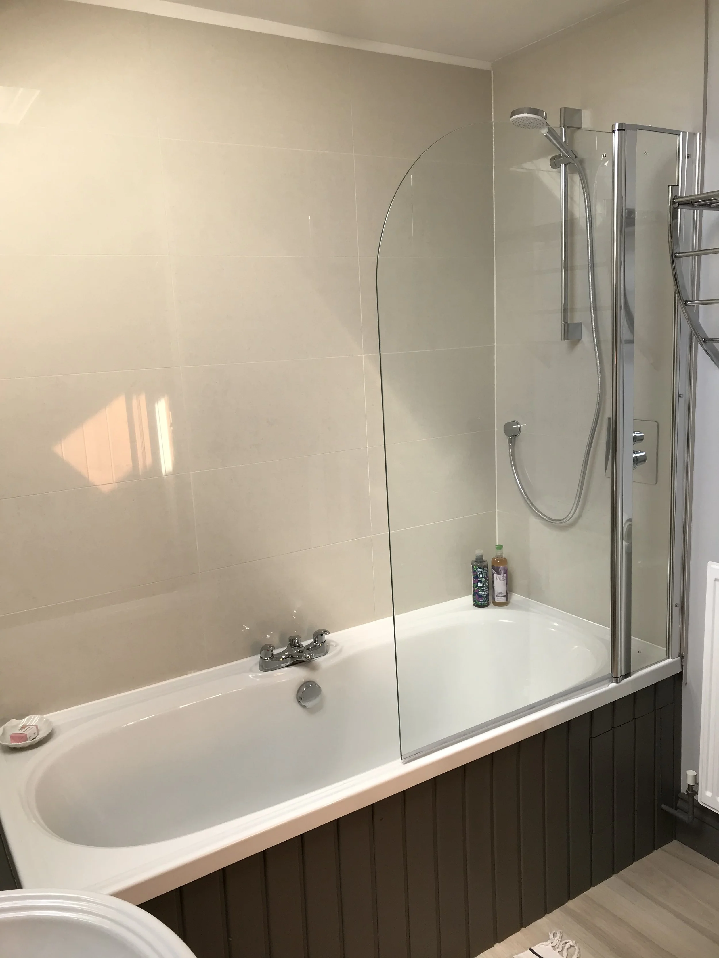 Large family bathroom with bath and fixed shower with glass screen over bath